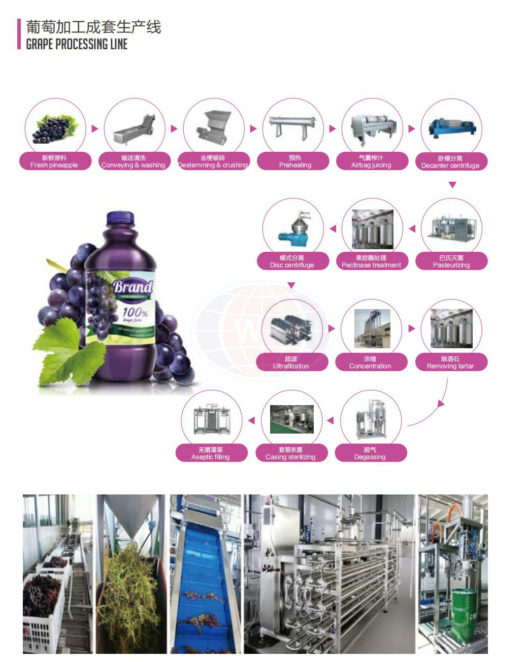 A uva fresca é limpa, selecionada, quebrada, suco e separada da fibra de celulose para obter suco fresco sem polpa. Esse processo é realizado automaticamente por máquina com alta eficiência.